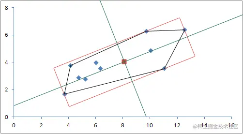 We can modify the above algorithm by instead computing the covariance matrix for the vertices that make up the convex hull of the data set. Mathematically, the convex hull of a set is the smallest convex set that contains all of the set elements. Intuitively, the convex hull can be visualized as the shape formed when a rubber band is stretched around the points.