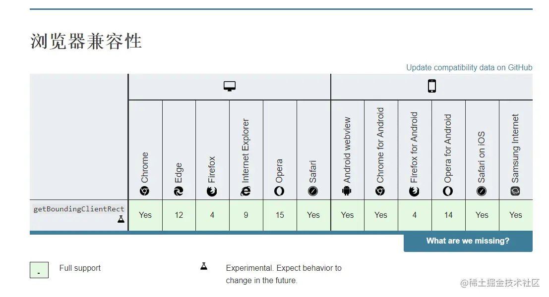 这个方法可以返回一个对象,这个对象包括当前dom 元素距离上、下、左、右的距离。getBoundingClientRect 也是一个实验中的功能,但是兼容性还不错