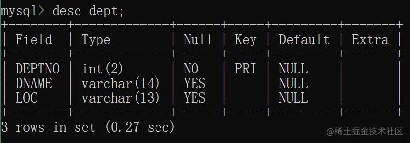 查看数据库中表dept结构: select * from dept; //注意:实际开发给用户反馈时肯定不能一查就查全表。