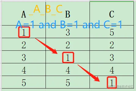 3\. ABD 复合索引可以只使用复合索引中的一部分,但必须是由最左部分开始,且可以存在常量。因复合索引为idx_A_B_C,所以查询条件只能是在a,ab,abc,ac才算,使用到索引idx_A_B_C。