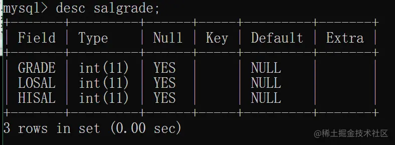 查看数据库中表emp结构:desc salgrade; #公司等级表