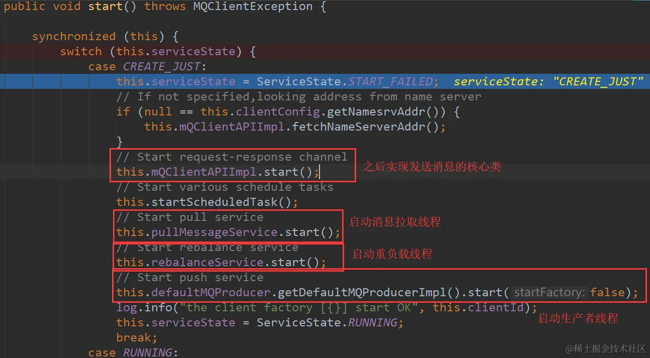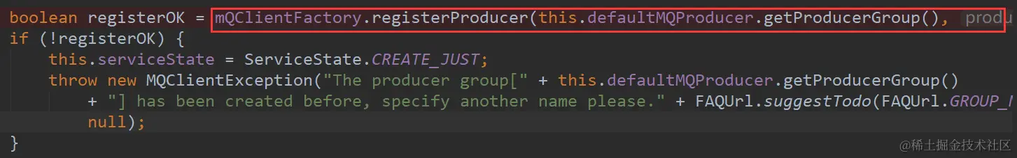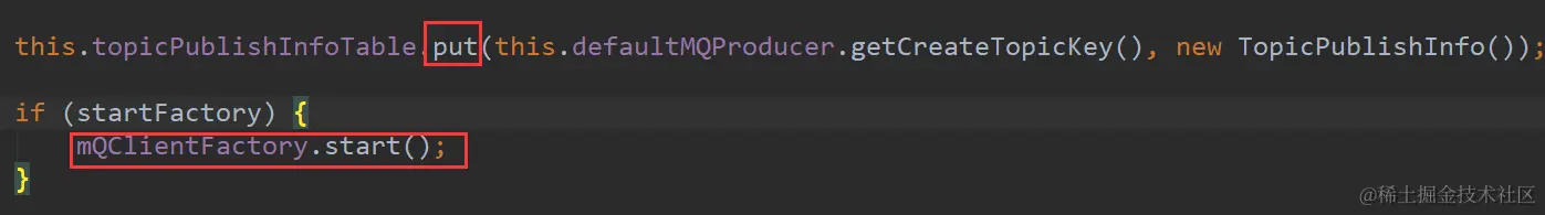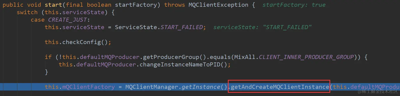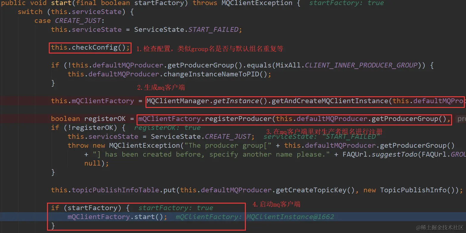 @Override public void start() throws MQClientException { this.defaultMQProducerImpl.start(); }这里初始化了MQClientFactory