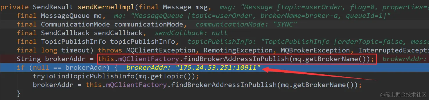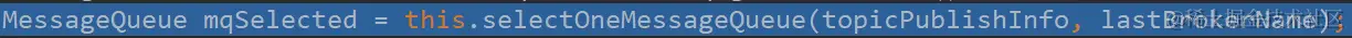 在这里首先它会进行一个容错策略判断,默认容错策略是false,也就是不进入容错策略语句分支中,如果容错策略为true,那么选择队列的策略是会去先选择lastBrokerName的消息队列topicPublishInfo:topic路由信息 lastBrokerName:上一个broker名称 public MessageQueue selectOneMessageQueue(final String lastBrokerName) { //如果上一个brokername为空直接随便选取一个消息队列,如果不为空为了负载均衡我们应尽可能避免这一次继续使用上一个brokername if (lastBrokerName == null) { return selectOneMessageQueue(); } else { //通过sendWhichQueue.getAndIncrement()方法获取自增字段,这样每次获取的index都会不同,达到了负载均衡的效果 int index = this.sendWhichQueue.getAndIncrement(); for (int i = 0; i < this.messageQueueList.size(); i++) { int pos = Math.abs(index++) % this.messageQueueList.size(); if (pos < 0) pos = 0; MessageQueue mq = this.messageQueueList.get(pos); //如果不等于上一次的brokername则直接返回该消息队列 if (!mq.getBrokerName().equals(lastBrokerName)) { return mq; } } //当我们只设置了一个broker那么只能使用该broker的消息队列,我们的topic是分布在多个broker中的,而每个broker中有多个topic,每个topic有多个消息队列,当我们只配置了一个broker,那么topic只能存在于这一个broker中 return selectOneMessageQueue(); } } -