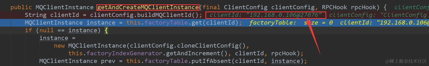 getAndCreateMQClientInstance方法首先取出之前生成的ClientId,ClientID是由客户端ip+@+实例名构建的,然后去factoryTable去尝试获取,如果为空则生成一个