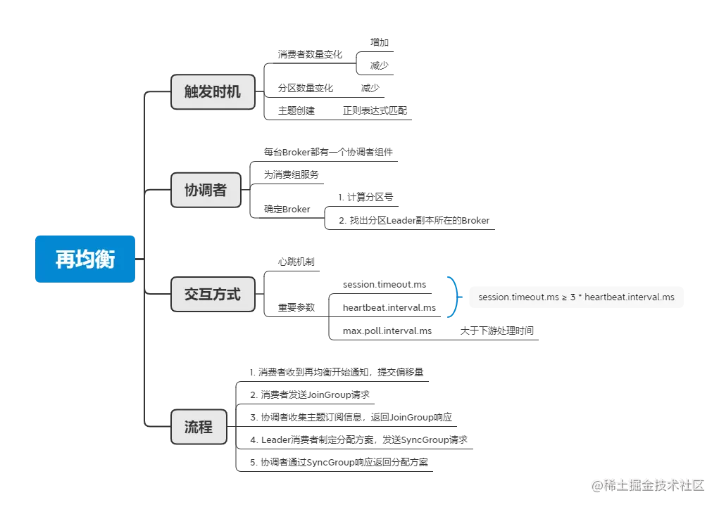 这一小节主要讲了协调者如何通知消费者开始再均衡,以及如何设置参数避免不必要的再均衡,下面我们看下再均衡的流程是怎么样的。