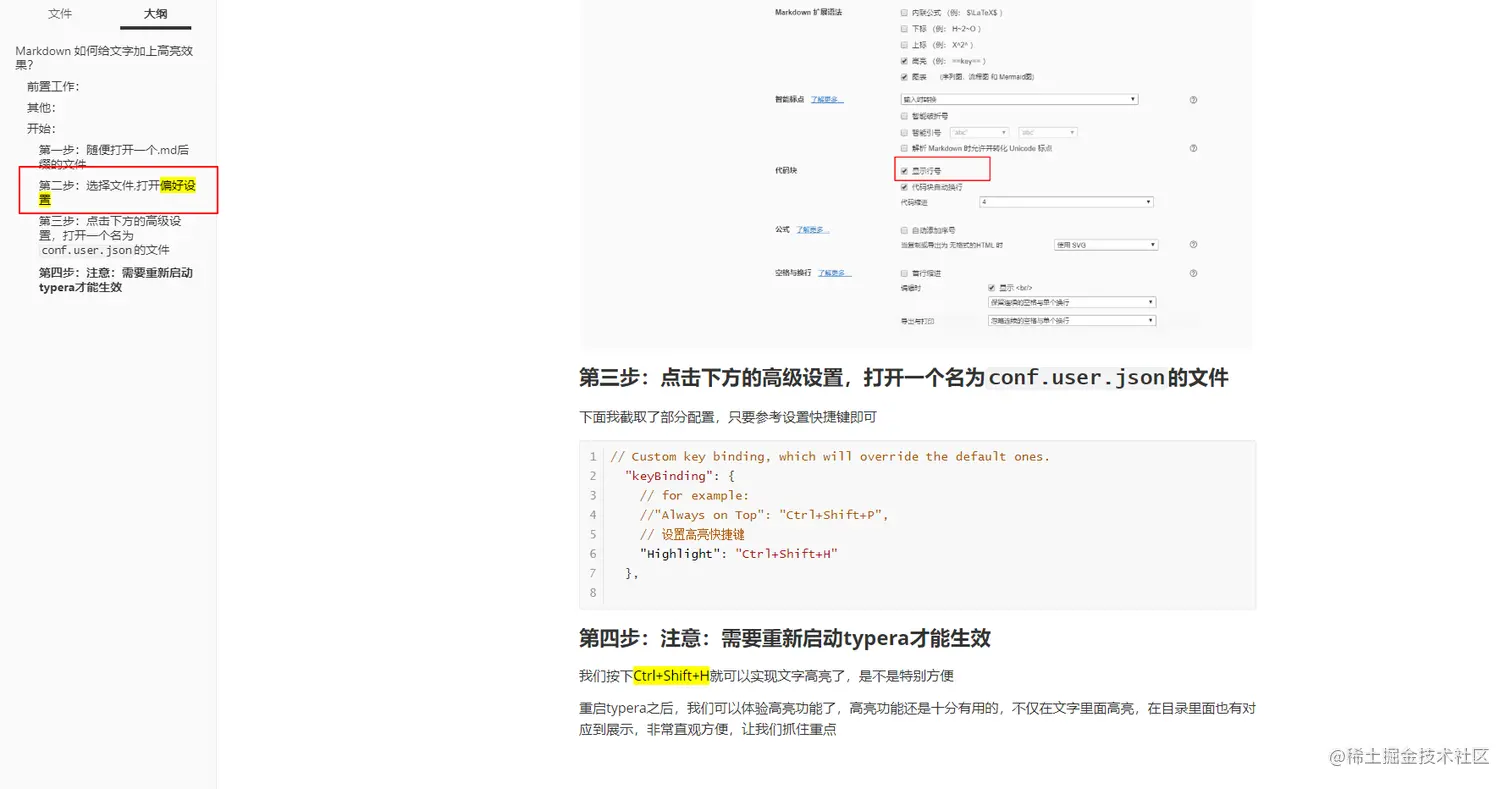 重启typera之后,我们可以体验高亮功能了,高亮功能还是十分有用的,不仅在文字里面高亮,在目录里面也有对应到展示,非常直观方便,让我们抓住重点