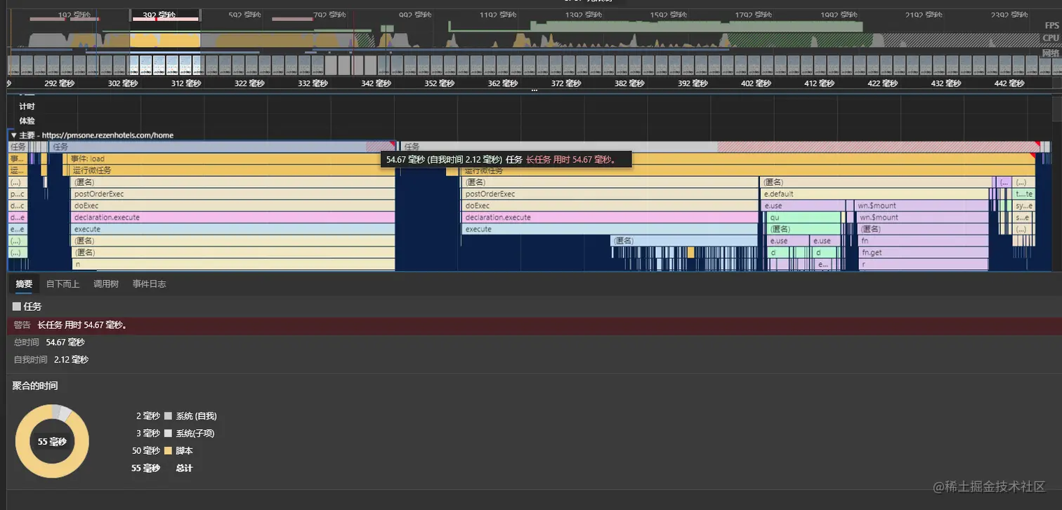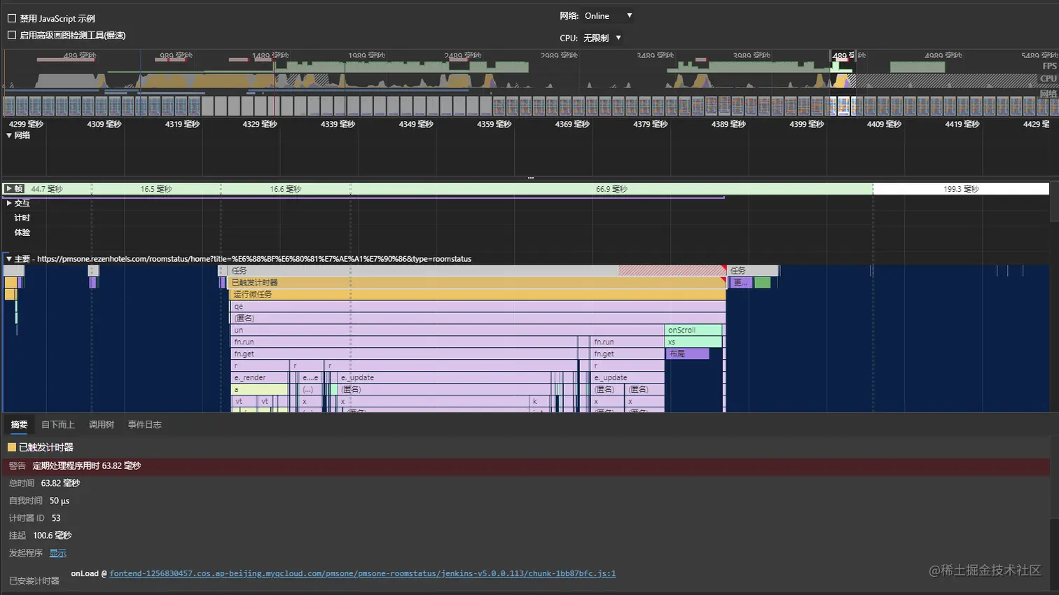 这个地方,是一个长列表,出现了红色的频率抖动,仔细看了一下,栈底是一个定时器。指定达到了 55.7ms,然后这块肯定是有一点问题的(还是长任务问题)