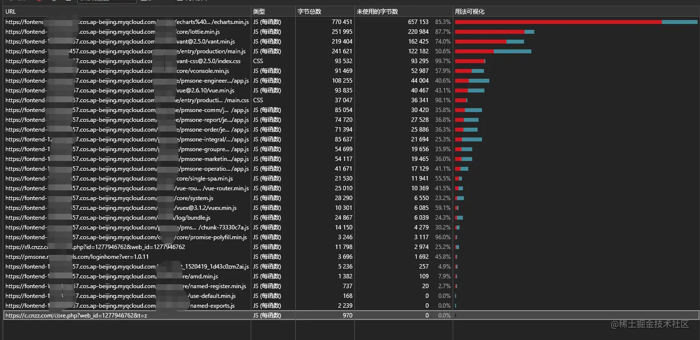 看一下这个,非常吓人了吧~ 85 %的代码是用不到的,有的三方库是提供了好几个版本的,比如xxx-min.js,或者xxx-runtime.js或者xxx-core.js,看到现在的这些无效的数字,可以考虑,重新选一下了