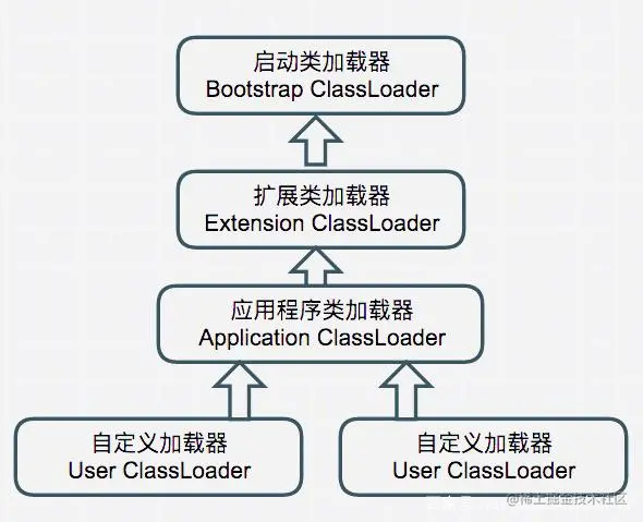 在虚拟机中存在4种类加载器,分别是启动类加载器、扩展类加载器、应用程序类加载器和自定义类加载器。前面三种是Java虚拟机预定义的类加载器,最后一种是我们通过继承ClassLoader抽象类实现的类加载器。