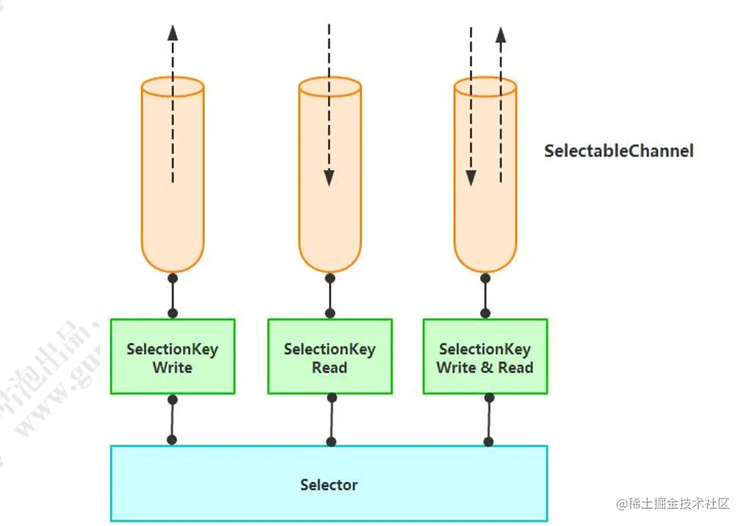 从图中可以看出,当有读或写等任何注册的事件发生时,可以从Selector 中获得相应的SelectionKey,同时从 SelectionKey中可