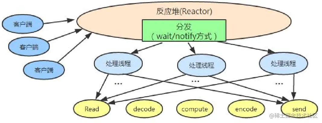 在Reactor模式中,事件分发器等待某个事件或者可应用或个操作的状态发生,事件分发器就把这个事件传给事先注册的事件处理函数或者回调函数,由后者来做实际的读写操作。如在Reactor中实现读:注册读就绪事件和相应的事件处理器、事件分发器等待事件、事件到来,激活分发器,分发器调用事件对应的处理器、事件处理器完成实际的读操作,处理读到的数据,注册新的事件,然后返还控制权。