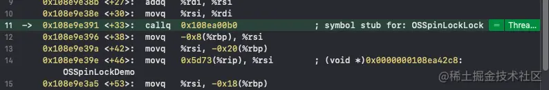 到callq(调方法),进入OSSpinLockLock,si进入,继续几个si...,然后进入_OSSpinLockLockSlow,继续si...