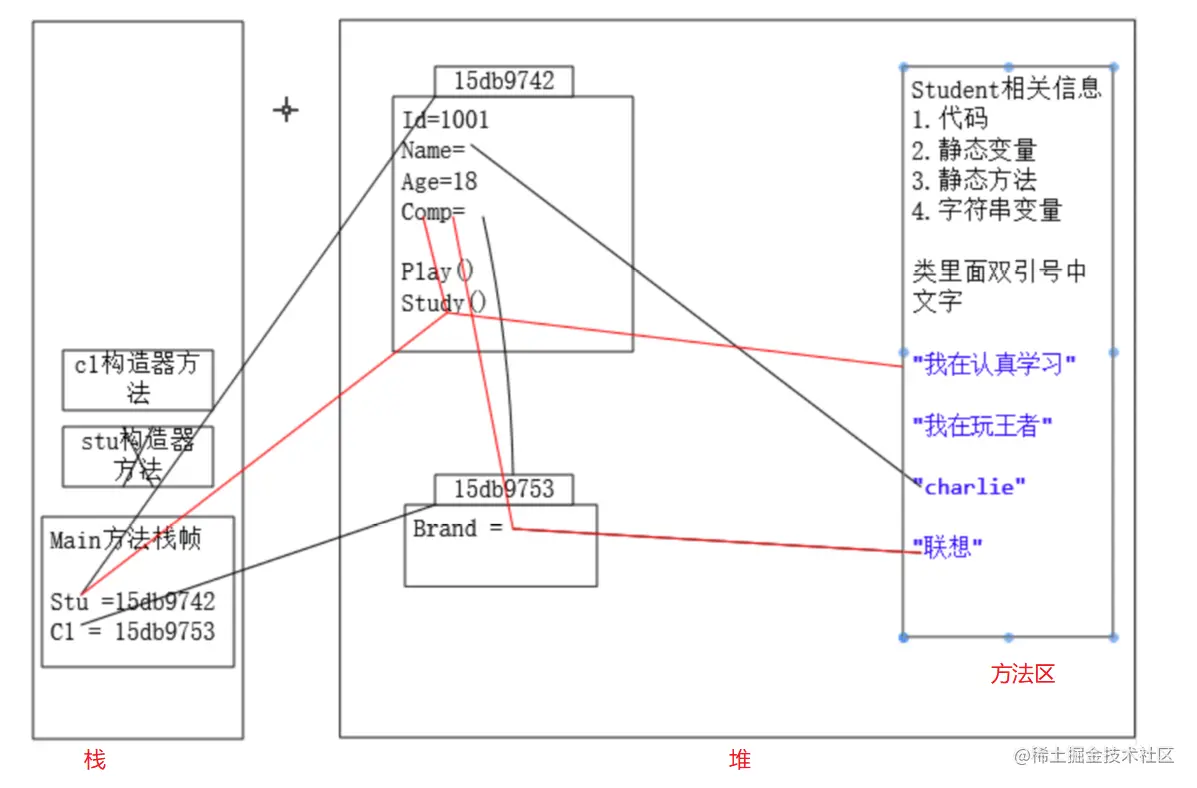 - 栈存放引用,堆存放具体的对象