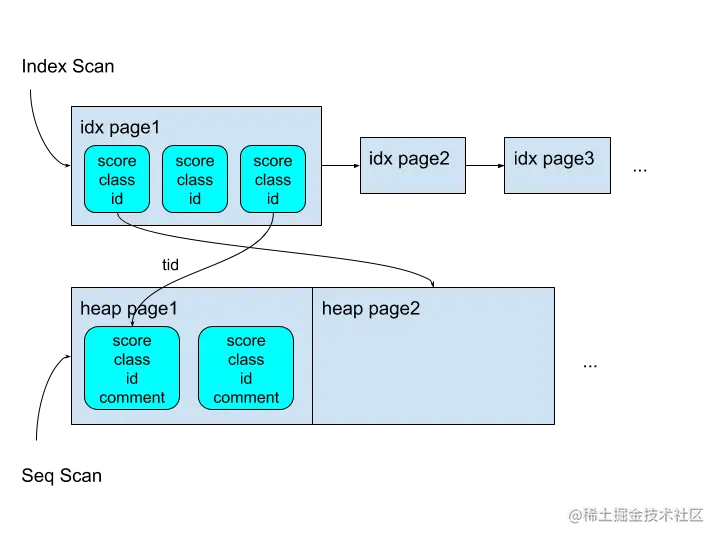 顺序扫描SeqScan,直接读取堆中的数据元组,由于不要求元组有序,因此基本都是顺序IO,但是每个数据元组对比对应的索引元组要大一些(多了comment字段)