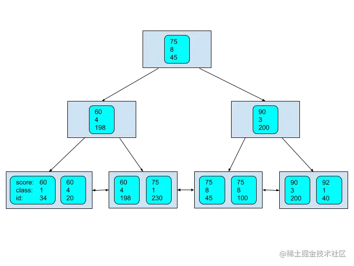 要重点留意的是复合索引中的数据是按索引字段定义的顺序来排序,在本例子中按(score,class,id)有序排列,即先按第一个字段score进行排序,如果score相同,再按第二个字段class排序,如果再相同,最后按id排序,一个简单示例如下: