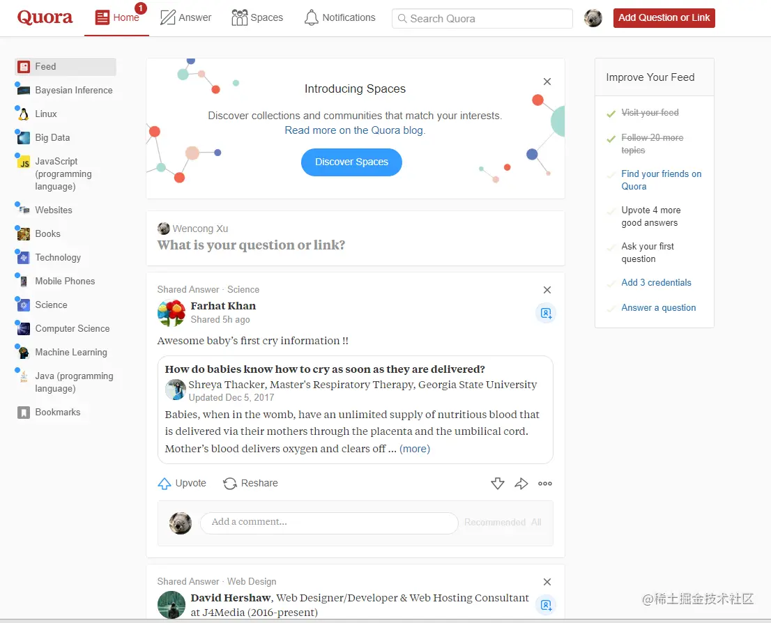 Quora 是一个问答SNS网站,用户通过Google或者Facebook帐号即可登陆,这是为了防止搜索引擎索引内容,但同时又让大众都可以参与,Quora的“肯定”功能和投票决定答案排序的功能会对内容质量有帮助,他就像一个中国版本的知乎,让各位想学习编程的小伙伴能够得到自己想要的高质量答案!