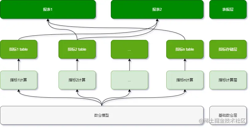 - 多个报表拥有相同口径的指标时,该指标的加工逻辑需要在多个报表中重复编写,修改时也需要多处修改,难免挂一漏万