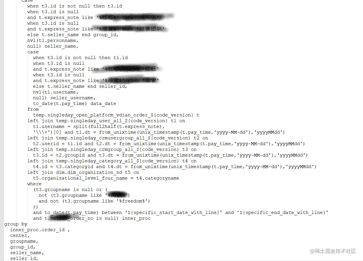下图是一个报表sql的脚本片段,它也一次性计算出了该表报的多个字段,有很复杂的加工逻辑