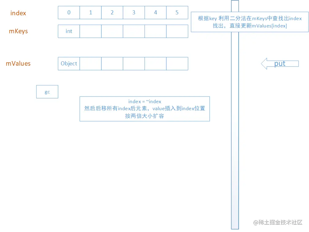 在put元素时,如果大小已经超过了mHashes.length,将会判断扩容大小