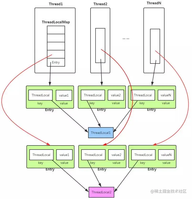 从上述代码可以看出 key 是当前ThreadLocal,key和value组成一个Entry存放在table中,从中可以看出,一个线程对应于一个ThreadLocalMap,内部有table数组,存放不同ThreadLocal和对应的Value值,当然一个ThreadLocal可以在不同的线程中使用,即调用set发方法。
