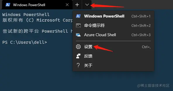3、打开软件 Windows Terminal 点击下拉按钮点击设置