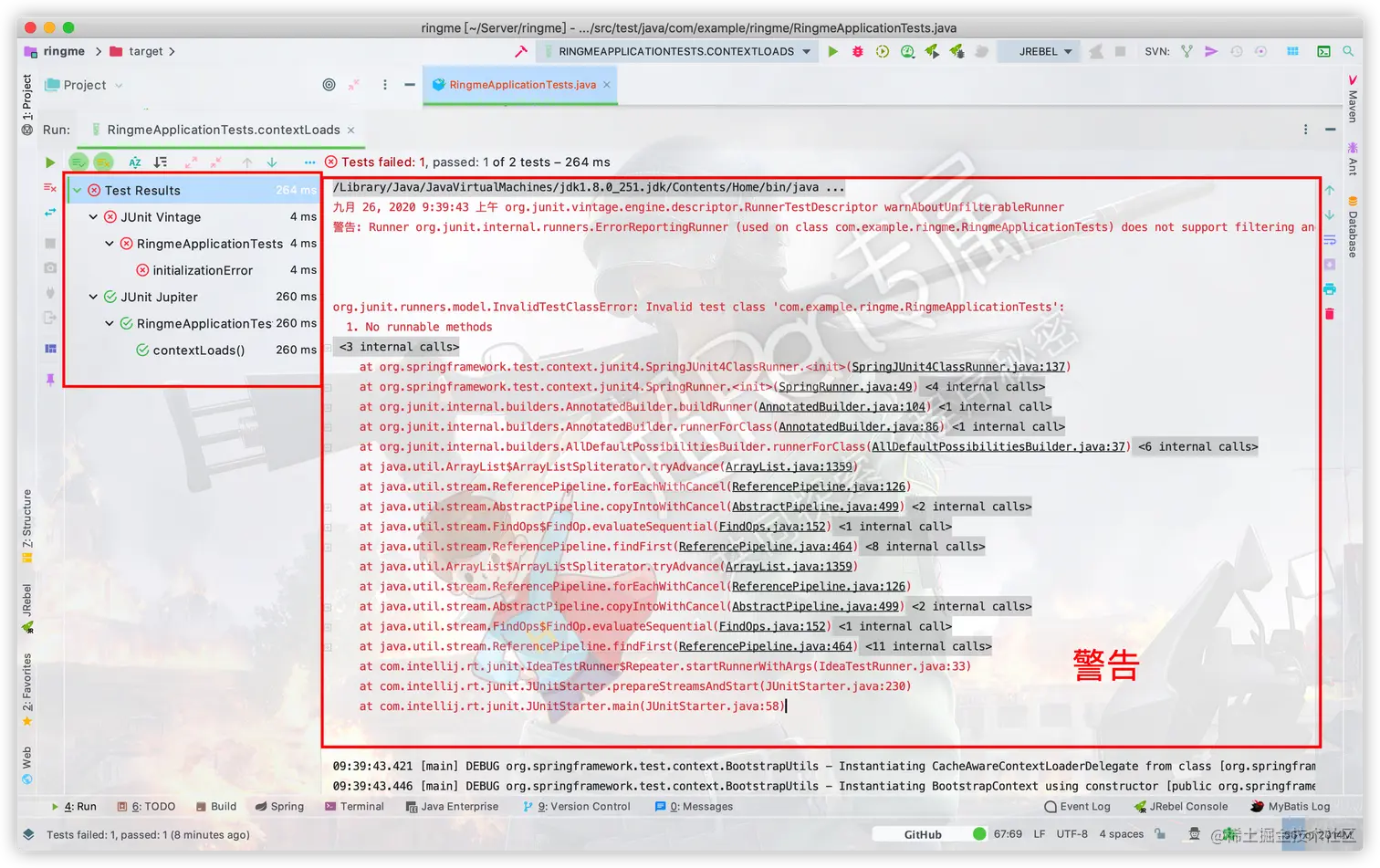 警告: Runner org.junit.internal.runners.ErrorReportingRunner (used on class com.example.ringme.RingmeApplicationTests) does not support filtering and will therefore be run completely.