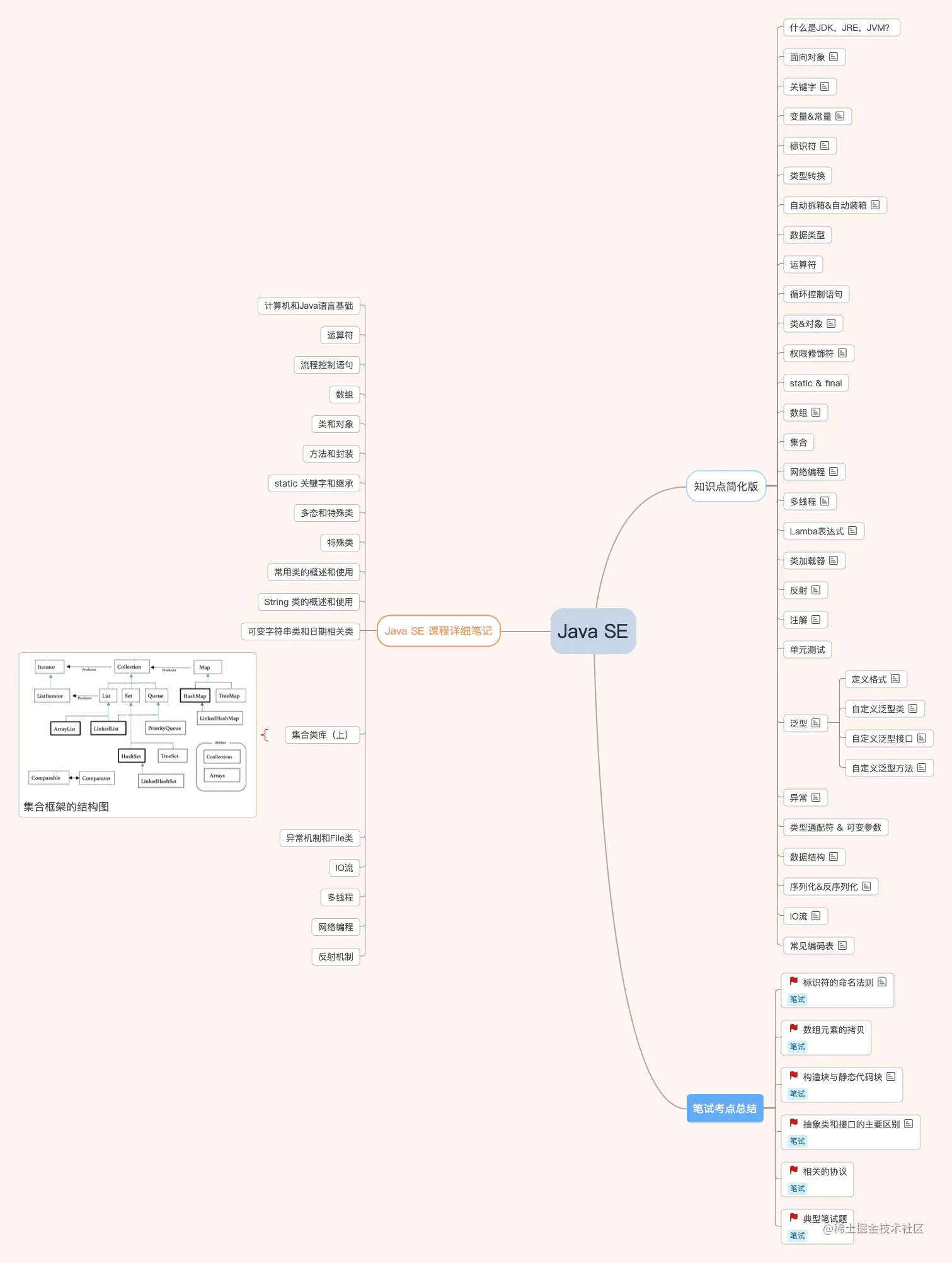 学习笔记:Java SE 阶段、知识点总结以及面试考点 草率了 2020-09-27 282 阅读1分钟 文章内容输出来源:拉勾教育大数据高薪训练营 脑图概览 详细可以戳一戳 🔗 宁不思维导图在线预览一下? 扩展知识 想到了一些自己在过去比较模糊的知识,打算重新整理一下。 本系列将持续更新…… 🔗 《Java源码学习:既熟悉又陌生的 String》 🔗 《JVM 内存模型》 🔗 《设计模式:工厂方法模式》 🔗 《设计模式:迭代器模式》 🔗 《设计模式:Singleton(单例), Prototype(原型) 和 Builder(建造者)》
