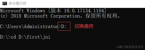首先打开cmd窗口,找到存放.mk以及.c代码的路径,是D:\first\jni, 在D盘下,所以先切换盘符至D盘,直接写入D即可,然后使用cd打开指定目录命令,cd到D:\first\jni目录,如下图所示。