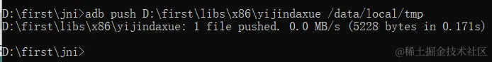 然后使用adb push命令将目标程序拷贝到指定的Android设备上,这里默认放在/data/local/tmp目录下,当然也可以放在其他目录下。看到输出信息,就表示成功,如下图所示。