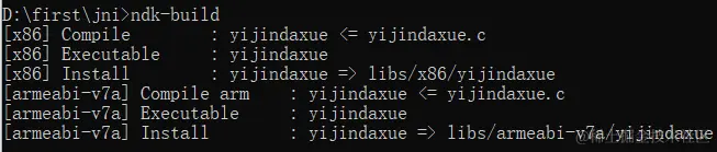 随后输入ndk-build命令,回车编译可执行程序。看到cmd里面输出libs/x86/ yijindaxue和libs/armeabi-v7a/yijindaxue信息,就表示原生程序编译好了,如下图所示。