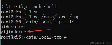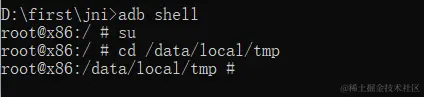 接下来输入adb shell命令,取得shell权限,由于在后面的操作中需要修改文件的权限,所以在这里还需要输入su命令取得root权限,为后面的操作做准备,如下图所示。