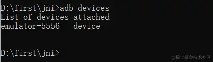 首先执行adb devices命令,检查设备是否正常连接,如下图所示。