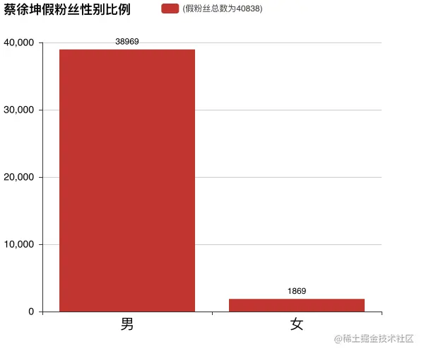 可见95397条假转发中,有40838个假粉丝。其中男性的比例高达95.42%!