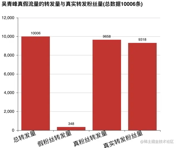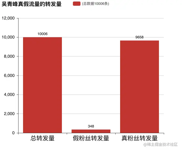 **那假流量所占的比例有多少呢?**在这随机抓取的10万条转发数据中,有多少是假的流量呢?