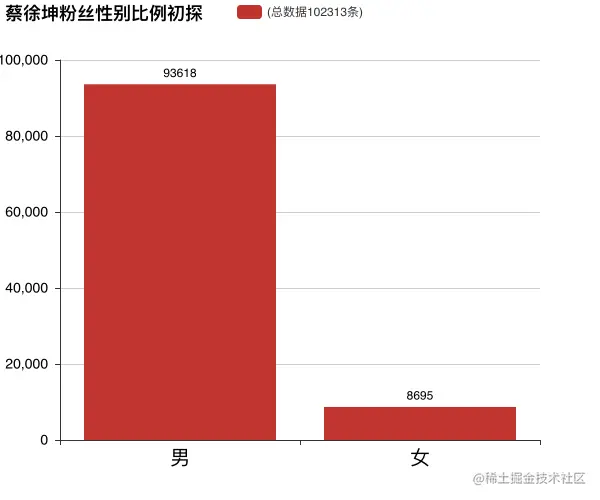 解答这个问题之前,我们其实对于蔡徐坤的粉丝性别比例更加感兴趣。按理来说应该他的女粉丝所占比例应该更大,但是我们统计了102313条转发数据中,有93618条是男粉丝转发的,只有8695条是女粉丝转发的。
