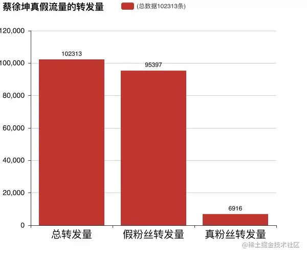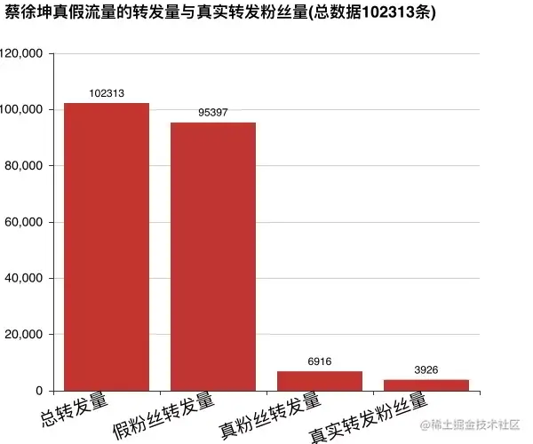 按照这个比例,可以推算出100万的转发中,真实转发的粉丝数为3.84万,说明蔡徐坤的粉丝群和影响力还是很大的,但远没有微博显示的全是100万+转发量那么大。
