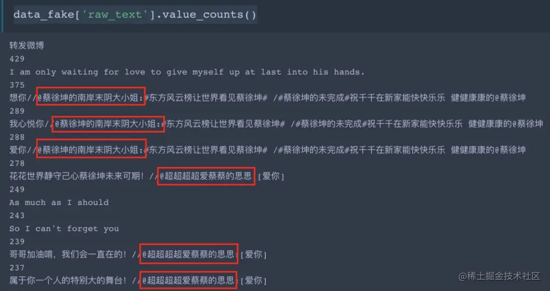 通过一番探索分析,我们把转发数据中转发者的关注或者粉丝数少于等于5、没有简介、转发之后被点赞数评论数再转发数都为0、微博会员等级为0级的数据,以及转发者的关注或者粉丝数大于等于5但昵称长“用户XXXXXXXX”这样的数据抽取了出来。