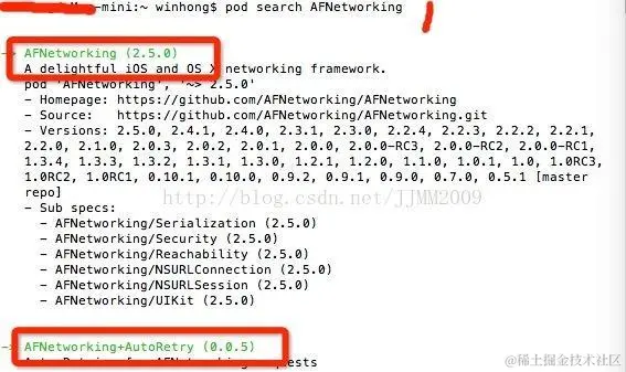 - 为了确定CocoaPods是否可以使用,可以用CocoaPods的搜索功能验证一下。在终端中输入: