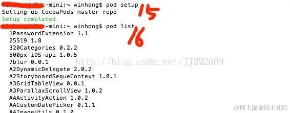 重新执行pod setup,过一段时间后提示setup completed,在终端中输入 pod list,展示出安装列表;