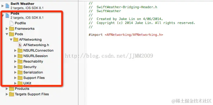 你也许会郁闷,为什么会出现.xcodeproj文件呢。这正是你刚刚运行$ pod install命令产生的新文件。除了这个文件,你会发现还多了另外一个文件“Podfile.lock”和一个文件夹“Pods”。 点击 CocoaPodsDemo.xcworkspace 打开之后工程之后,你会惊喜地发现,AFNetwoking已经成功导入项目了!
