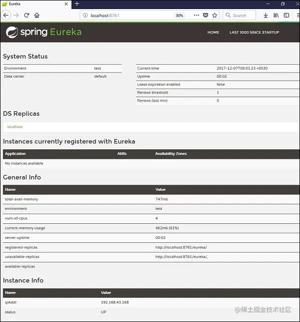 接下来,在 web 浏览器中单击 URL http://localhost:8761/,可以发现 Eureka 服务器已经运行在 8761 端口,如下所示:
