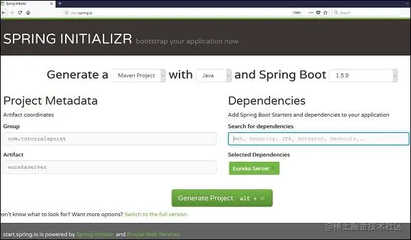 访问 Spring 初始化器主页 start.spring.io/ 并下载 Spring Boot 工程的 Eureka 服务器依赖。如下图所示:
