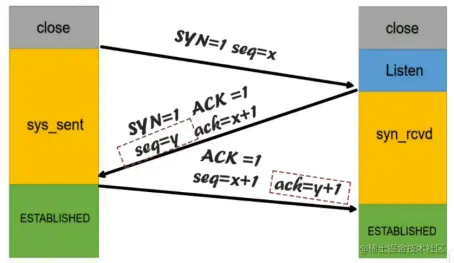 - 第三次握手:客户端发送ACK确认信号,发送自己的序号seq=x+1,发送对方的确认号ack=y+1