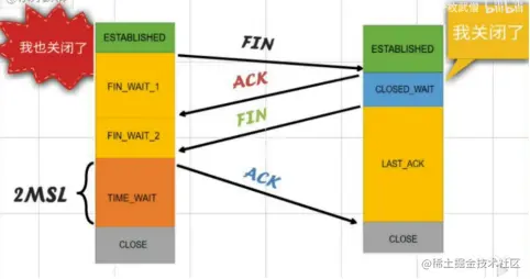 - 第四次挥手:客户端收到回复后,发送确认ACK=1,ack=w+1,自己的seq=u+1,客户端进入TIME-WAIT(时间等待)。客户端经过2个最长报文段寿命后,客户端CLOSE;服务器收到确认后,立刻进入CLOSE状态。、