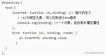 el:指令所绑定的元素,可以用来直接操作 DOM 。binding:一个对象,包含以下属性:name:指令名,不包括 v- 前缀。value:指令的绑定值,例如:v-my-directive=“1 + 1” 中,绑定值为 2。oldValue:指令绑定的前一个值,仅在 update 和 componentUpdated 钩子中可用。无论值是否改变都可用。expression:字符串形式的指令表达式。例如 v-my-directive=“1 + 1” 中,表达式为 “1 + 1”。arg:传给指令的参数,可选。例如 v-my-directive:foo 中,参数为 “foo”。modifiers:一个包含修饰符的对象。例如:v-my-directive.foo.bar 中,修饰符对象为 { foo: true, bar: true }。vnode: Vue编译生成的虚拟节点。移步 VNode API 来了解更多详情。oldVnode:上一个虚拟节点,仅在 update 和 componentUpdated 钩子中可用。