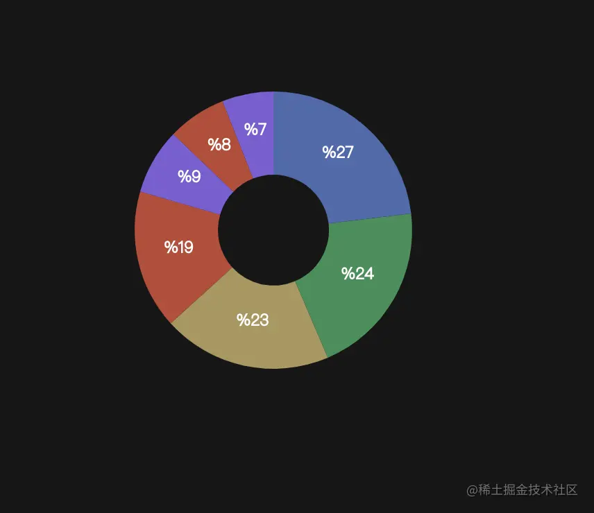图表可以同时展示两套数据,对于做数据可视化大屏业务的系统可以很大程度的节省空间位置,参数都是动态化,可以自动计算数据量,中间详情通过数据条数自动布局,角度=360/条数。