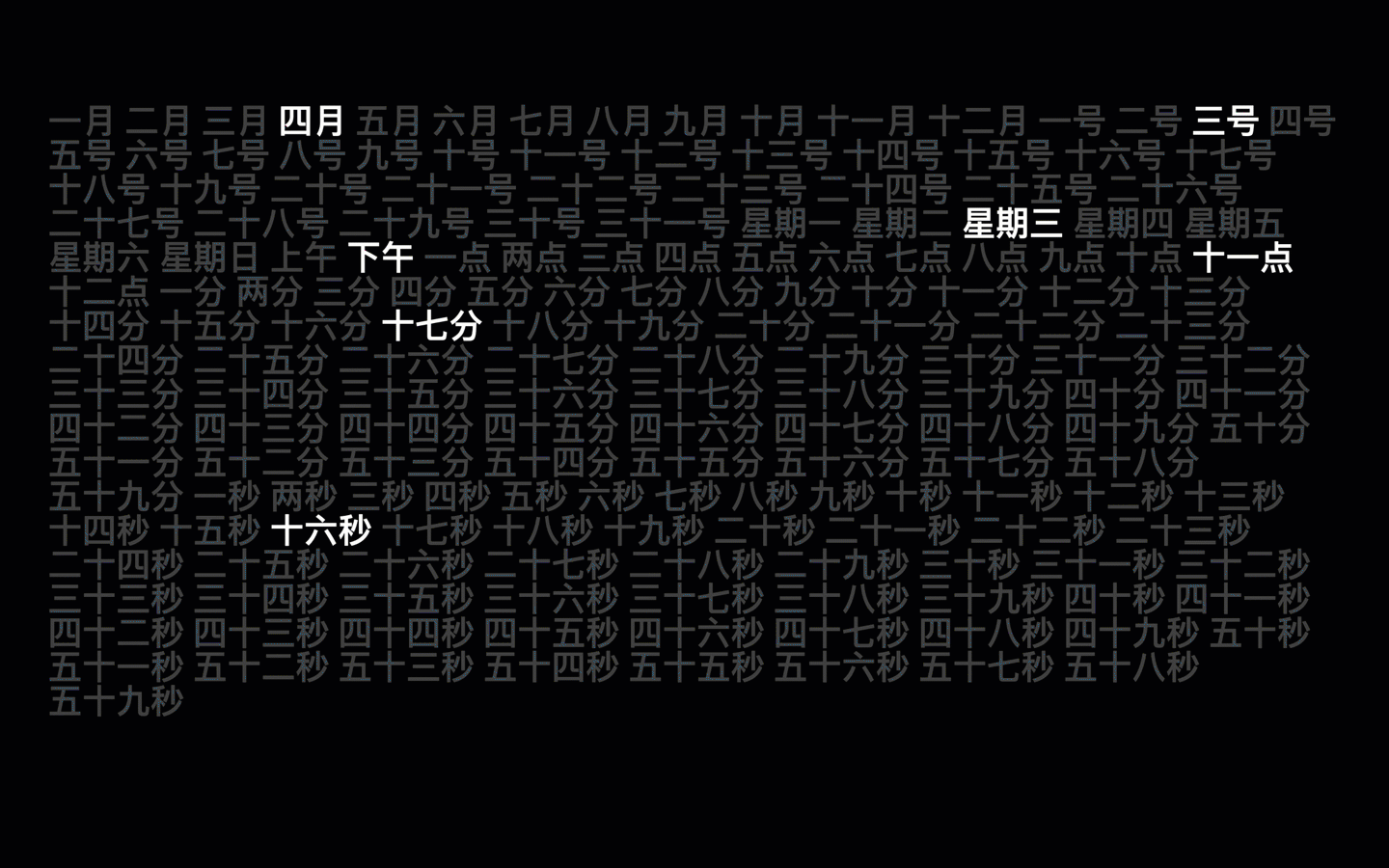 让我们一起踏进 Word clock 那片文字云之中。Word Clock Mac版提供了用户几十种语言、高度自定义的字体可供选择。时钟屏保的当前日期与时间会高亮显示。我们身处钢筋水泥之林,也可以借助另一种语言的时间,想象挪威的森林或者芬兰的湖泊。