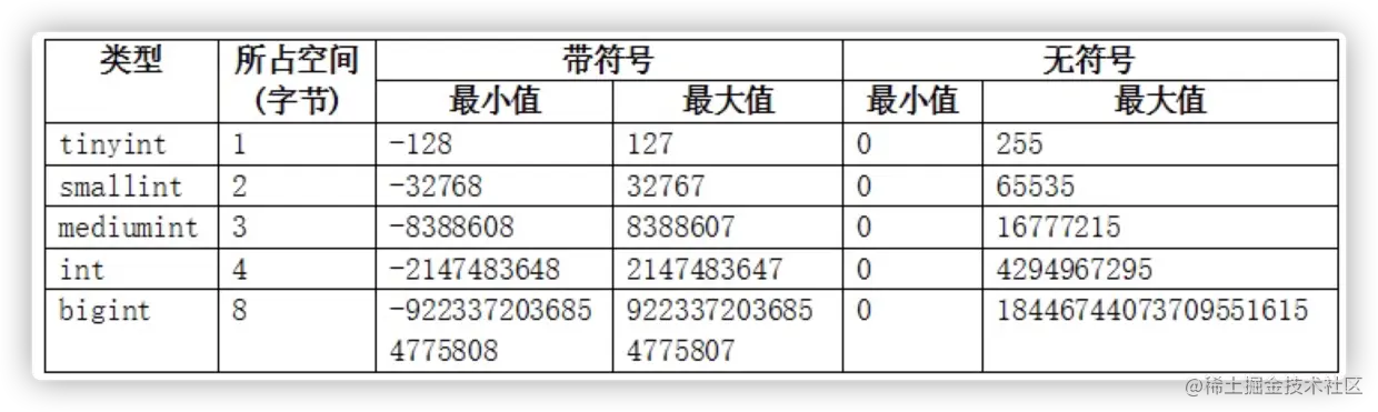 默认整数类型是带符号的,即可以有正负值,此时,id 和 age 中都可以存储负数(但都不能超出范围):