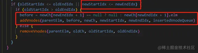 1.首先会进行时间复杂度 O(n)的while循环,循环条件为 "遍历旧节点数组&&遍历新节点数组,谁先遍历完循环就结束" ,源码如下图: