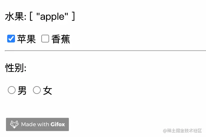 但是在使用 radio 和 checkbox 的时候,我们一般是以组的形式使用,我们一般不需要 checked 的值,而是需要 value 的值,这个时候我们可以这么使用: